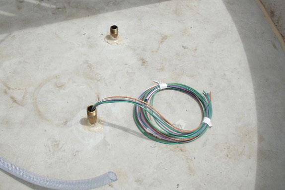 The pump itself is run from a standard high voltage wire. We cap the penetration with a threaded and glued fitting and use a power disconnect coupling to supply power to the pump. This way you can simply lift the disconnect out of the water and shut down the pump without having to drain the surround pool to turn it off.