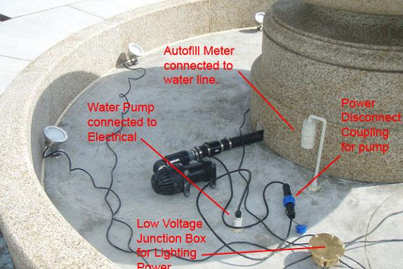 We typically include 3 penetrations in the fountain slab to accommodate waterlines from the home or sprinkler system to run an autofill system, a standard high voltage wire to power the fountain pump, and an additional low voltage wire to power fountain lights. Even if you don’t desire to add an autofill system or lighting initially, we highly recommend that you have the penetrations included when the slab is poured. It will be much less expensive to have them included at this stage rather than coring out the concrete and adding them at a later date!